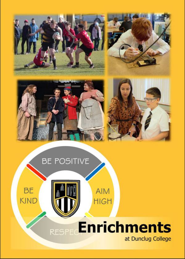 Enrichment Programme 2025/26 Click here to download a copy of the Enrichments available at Dunclug College for the 2025/26 academic year. There is something for everyone! Enrichments 2025.pdf Adobe Acrobat document [26.0 MB]